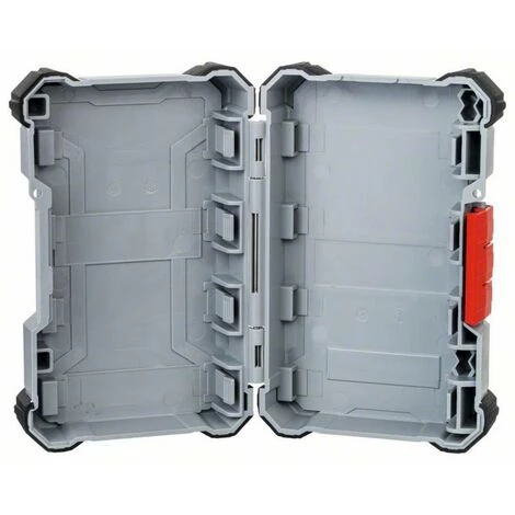 La boîte vide L conserve les accessoires assemblés individuellement. La boîte vide possède des tiroirs pour l’enclenchement sûr des supports en plastique de chaque embout et permet ainsi de nombreuses possibilités de conception. La boîte vide Pick and Click L possède deux pages d’enregistrement pour la conservation des bits. Il est également équipé d’amortisseurs en caoutchouc pour une protection et une robustesse dans les environnements difficiles. La boîte fait partie du système Bosch Pick and Click qui permet de personnaliser des accessoires pour des jeux d’embouts parfaitement flexibles. Les tiroirs à encliquetage garantissent les paquets de bits achetés individuellement pour une collecte personnalisée et un remplacement simple des anciens paquets de bits. Ce texte a été traduit par une machine.