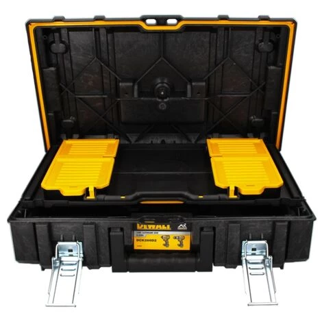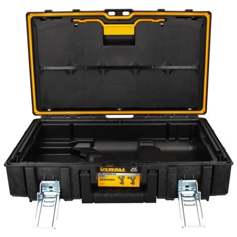 Le Tough Box DS 150 de DeWalt est un coffret de transport super résistant aux chocs et robuste avec des parois de 4 mm d’épaisseur. Il est empilable, étanche à la poussière et protégée contre les projections d’eau. De plus, le DS 150 est équipé d’un bouton pour équilibrer la pression de l’air à l’intérieur et à l’extérieur du coffret. À l’extérieur, des œillets encastrés peuvent être utilisés pour y insérer des cadenas, ainsi qu’un crochet en acier pour l’accrocher à un dispositif mural. Ses fermoirs en acier inoxydable à l’avant sont également très robustes et résistants à la rouille. Les poignées du Tough Box DS 150 de DeWalt sont faits à base de 2 matériaux ( polypropylène + élastomère thermoplastique TPR) et sont donc également particulièrement robustes et résistantes aux chocs. Son intérieur se compose d’un grand compartiment et d’un insert amovible pouvant loger deux batteries de 2,0 Ah, une visseuse à percussion, une perceuse-visseuse et un chargeur. Une deuxième surface dans le couvercle de ce coffret de transport sert rangement supplémentaire qui peut être remplie avec des embouts, des forets, mais aussi des chevilles, des vis et autres accessoires.