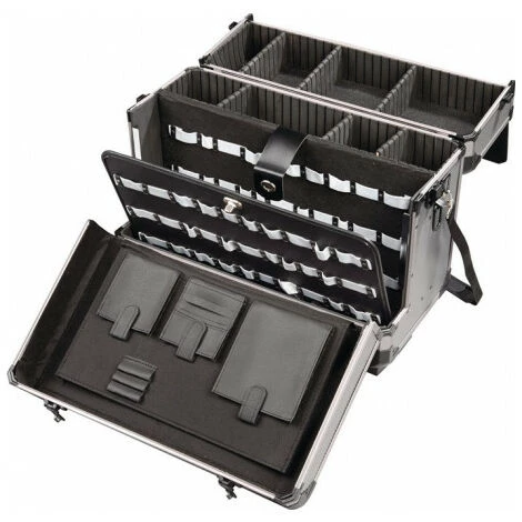 rollbar · Boîte à outils en aluminium · Couvercle en 2 parties (différentes façons d’ouvrir la valise) · Verrouillage latéral supplémentaire · Avec deux tableaux d’outils (1 x à l’un, 1 x équins sur les deux côtés) · Répartition flexible · Supports supplémentaires pour les stylos et cartes de visite, etc. deux chiffres Poignée de confort · Attache amovible · Châssis amovible · Poignée télescopique Autres caractéristiques techniques: · Largeur : 490mm · Couleur : argent · Matériau : Aluminium · Profondeur : 245mm · Hauteur : 355mm. Version: 2 panneaux porte-outils, Type: sur roulettes. Version: 2 panneaux porte-outils, Type: sur roulettes