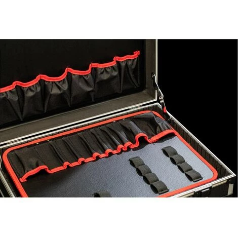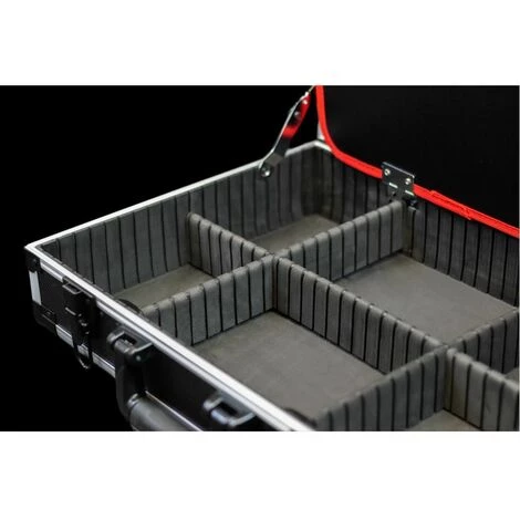 Meister Boîte à outils vide, 460 x 320 x 140 mm L’étui d’outils maître vide est idéal pour stocker des outils, des assortiments ou de petites pièces. Divisez les plateaux individuellement en fonction de vos besoins – les cinq partitions sont amovibles et peuvent être utilisées à n’importe quelle position. La garniture en mousse garantit toujours la protection nécessaire de vos ustensiles. Dans les 15 inserts des poches à outils, des outils supplémentaires fréquemment utilisés peuvent être rangés clairement et prêts à manipuler. De plus, les bandes velcro et de caoutchouc offrent une tenue stable, par exemple pour de petites boîtes de pièces ou des ensembles de bits. Grâce à l’insert intermédiaire pratique, des centres d’outils étendus peuvent également être logés compacts. Si des ressources de travail sont nécessaires dans la partie inférieure de la valise, l’insert peut être fixé sur le côté à l’aide des supports stables. Les coins antichoc et les solides fermetures de serrage de la valise en aluminium de haute qualité garantissent un stockage sûr. Avec l’aide de la poignée de transport confortable, vous pouvez également porter la valise sans effort de A à B.