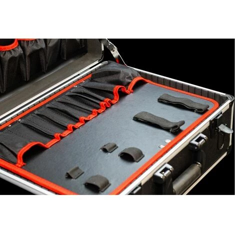 Meister Outil de chariot vide, 460 x 350 x 190 mm Le chariot à outils vide de Master est idéal pour stocker des outils, des assortiments ou de petites pièces. Divisez les plateaux individuellement en fonction de vos besoins – les cinq partitions sont amovibles et peuvent être utilisées à n’importe quelle position. La garniture en mousse garantit toujours la protection nécessaire de vos ustensiles. Dans les 15 inserts des poches à outils, des outils supplémentaires fréquemment utilisés peuvent être rangés clairement et prêts à manipuler. De plus, les bandes velcro et de caoutchouc offrent une tenue stable, par exemple pour de petites boîtes de pièces ou des ensembles de bits. Grâce à l’insert intermédiaire pratique, des centres d’outils étendus peuvent également être logés compacts. Si des ressources de travail sont nécessaires dans la partie inférieure de la valise, l’insert peut être fixé sur le côté à l’aide des supports stables. Les coins antichoc et les solides fermetures de serrage de la valise en aluminium de haute qualité garantissent un stockage sûr. Avec l’aide de la poignée pull-out et des rouleaux intégrés, le chariot peut être transporté confortablement de A à B.