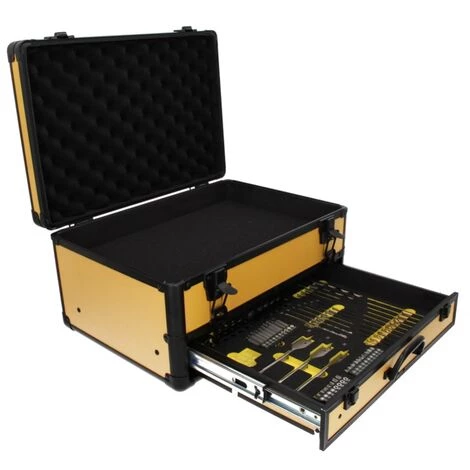 La mallette à outils en aluminium Toolbrothers TX, avec son insert en mousse cubique universellement adaptable, offre suffisamment d’espace pour une machine (par exemple une clé à chocs), un chargeur et jusqu’à deux batteries. Toutes les applications sont couvertes par le jeu d’embouts et de forets de 70 pièces dans le tiroir. Les embouts, les fraises, les clés à douille et les forets sont disponibles dans de nombreuses variantes. Qu’il s’agisse de bois, de métal ou de pierre, la mallette contient une variété de forets dans les tailles les plus courantes. La bonne finition du boîtier promet une longue durée de vie et est également très agréable à regarder. La poignée de transport caoutchoutée est douce pour la paume des mains et peut également être utilisée sans problème avec des gants. Les fermoirs métalliques de la valise sont robustes et durables. Les inserts dans le fond et dans le couvercle assurent un transport sûr des machines dans la mallette. Avec la mallette en aluminium TX, vous avez les outils de travail et les accessoires correspondants rangés en toute sécurité dans une mallette.