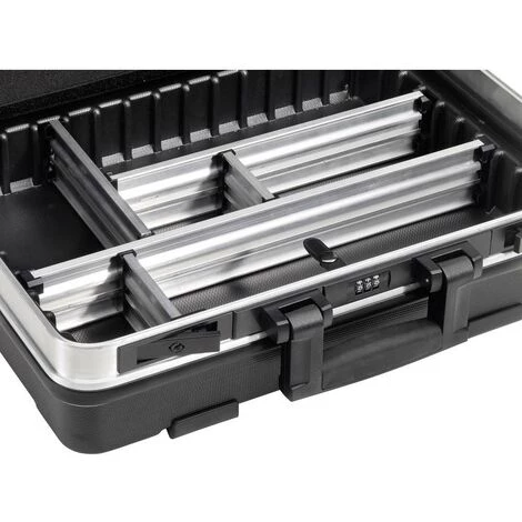 Pratique dans la manipulation, extrêmement dans la capacité, moderne dans le design et toujours dans le même temps! Mallette à outils mobile en matériau ABS avec poignée télescopique adaptée à l’application et 2 roulettes en ligne. Un cadre en aluminium robuste et un rebord de protection au niveau des arêtes protègent la mallette ainsi que les outils qu’elle contient. 2 serrures à bascule verrouillables et un cadenas à code PROFIcode garantissent la sécurité. 4 patins en caoutchouc permettent de ne pas abîmer la mallette et de lui offrir une meilleure stabilité au sol. Une poignée robuste et agréable à prendre en main vous offre le confort nécessaire pendant le transport de la mallette. Sa coque inférieure est réglable à l’aide de barres en aluminium (2 barres de séparation en alu, 4 embouts d’extremité, 2 embouts centraux). Il dispose d’un compartiment pour documents au format A4, d’un cache à charnière et d’un support de couvercle de sécurité. Ce texte a été traduit par une machine.