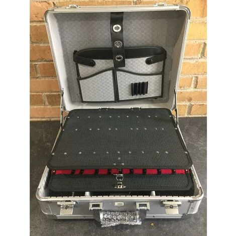 Mallette en aluminium avec serrure. A deux panneaux d’outil avec Ă©lastiques et deux poches de document de grande taille. Compartiment infĂ©rieur avec diviseurs et bandoulière. LivrĂ© sans outils.