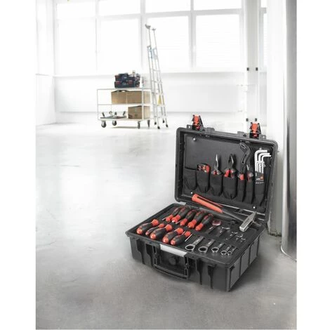 • répond à vos besoins: Handy, boîtier robuste équipé de mobilier de base d’outils à main de haute qualité pour le mécanicien mobile. </ B> En utilisation mobile, il n’est pas facile de porter tous les outils nécessaires tout en maintenant la commande. Avec le boîtier de l’outil de base, le mécanicien mobile a un équipement convaincant et ne perd pas la vue d’ensemble. Pour l’équipement de base optimal, la boîte à outils pratique est équipée d’une gamme d’outils à main de haute qualité. Des tournevis ergonomiques, via une sélection de pinces à un jeu de clé à roulettes à roulettes, l’utilisateur dispose de l’outil approprié pour chaque situation de travail. De plus, grâce à d’autres boucles et à d’autres espaces de stockage, la valise offre beaucoup d’espace pour d’autres équipements supplémentaires individuels. Les valises en polypropylène en polypropylène garantissent la robustesse et peuvent être fixées contre le vol grâce aux œillets intégrés avec des cadenas contre vol (ceux-ci ne sont pas inclus). Pour un confort portant agréable, la poignée à deux composants ergonomique assure. Également pour les vols, le boîtier de l’outil Basic convient parfaitement grâce à la vanne d’égalisation de la pression atmosphérique et peut être clairement affecté au propriétaire avec une étiquette de nom existante et auto-étiquetée. Certifié après la classe de protection IP 67, le boîtier de l’outil de la DIHA est poussière et imperméable. Avec son volume de socket 20L et sa capacité de charge admissible allant jusqu’à 14,2 kg, il est préparé pour une grande variété de conditions de fonctionnement.