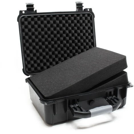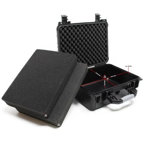 | Application / Information / Caractéristiques | Coque à la fois légère et solide 3 couches de mousse amovibles (mousse à picots dans le couvercle, dés de mousse prédécoupés, mousse de sol fine) Angles arrondis 2 fermetures à ressort Résistant aux chocs, à la pression, à la poussière et à l’humidité Compensation de la pression atmosphérique grâce à la soupape de pressurisation 2 oeillets pour cadenas Ø 10mm |